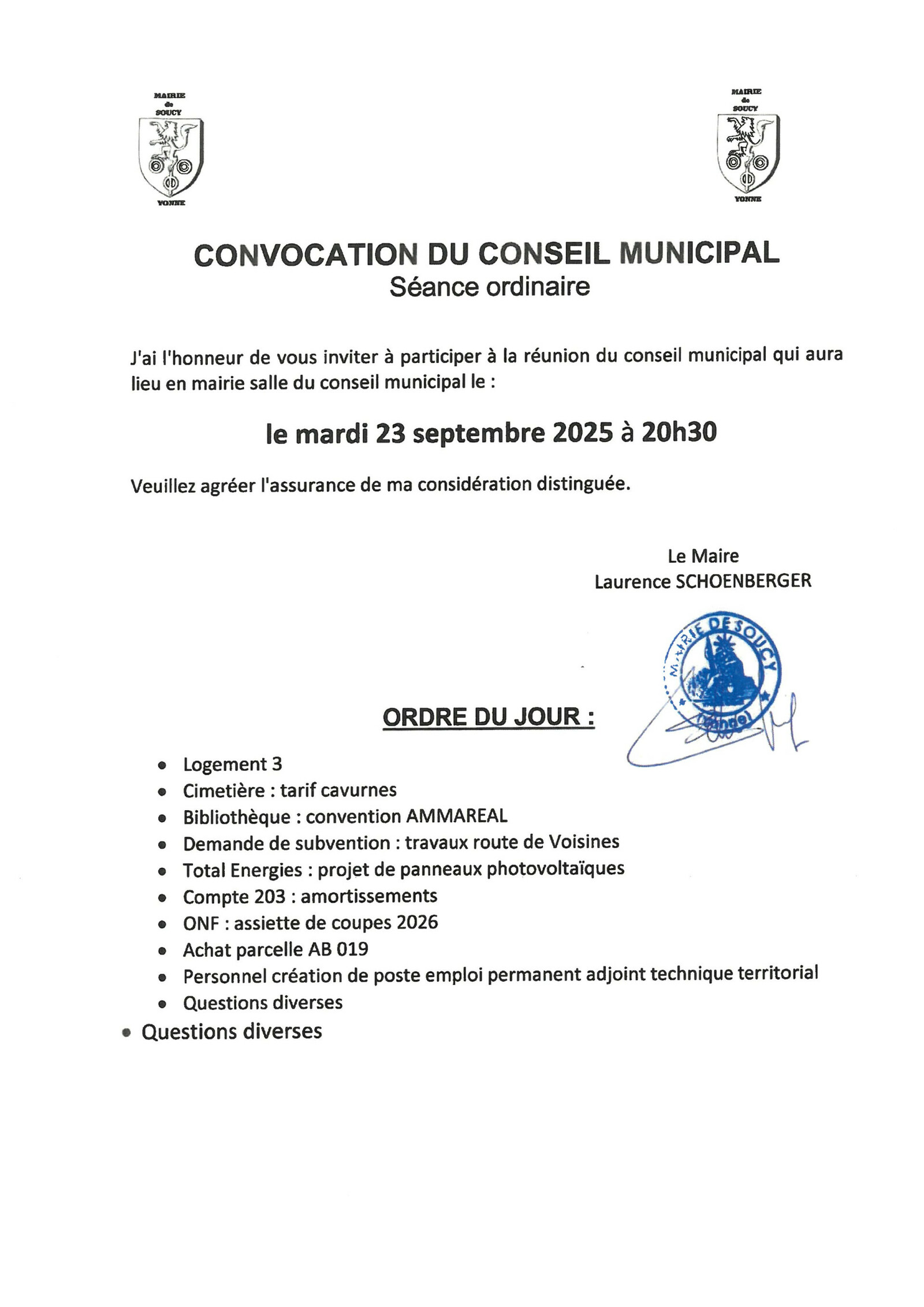 La Municipalité organise un Conseil Municipal le mardi 23 septembre 2025 à 20h30. Venez assister à cette réunion pour en savoir plus sur les décisions et projets en cours dans votre commune.